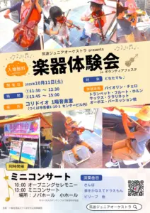 筑波ジュニアオーケストラpresents ミニコンサート&楽器体験会バイオリン・チェロ・トランペット・フルート・ホルン・サックス・クラリネット・オーボエ・パーカッションなどなど!いろいろな楽器を体験できます。