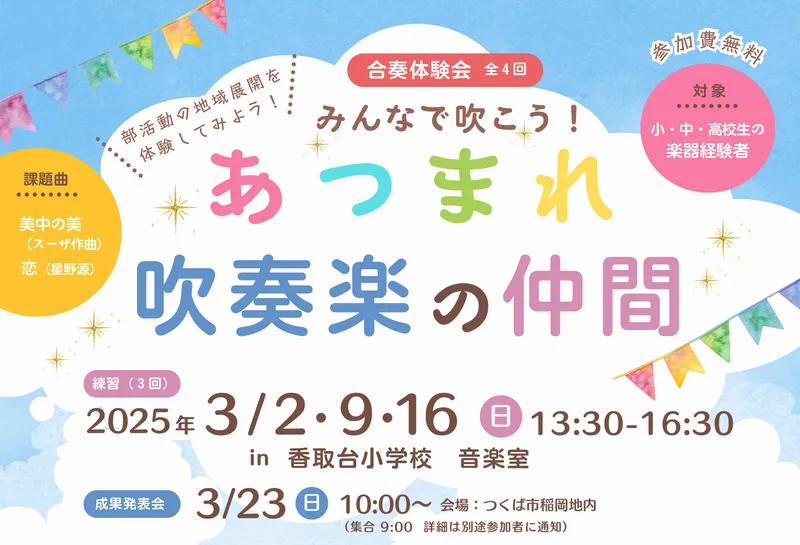 この度、つくば市教育委員会と共催で、地域の全生徒を対象とし、学校の枠を越えた吹奏楽部の体験会を企画いたしましたので、是非ご参加ください。