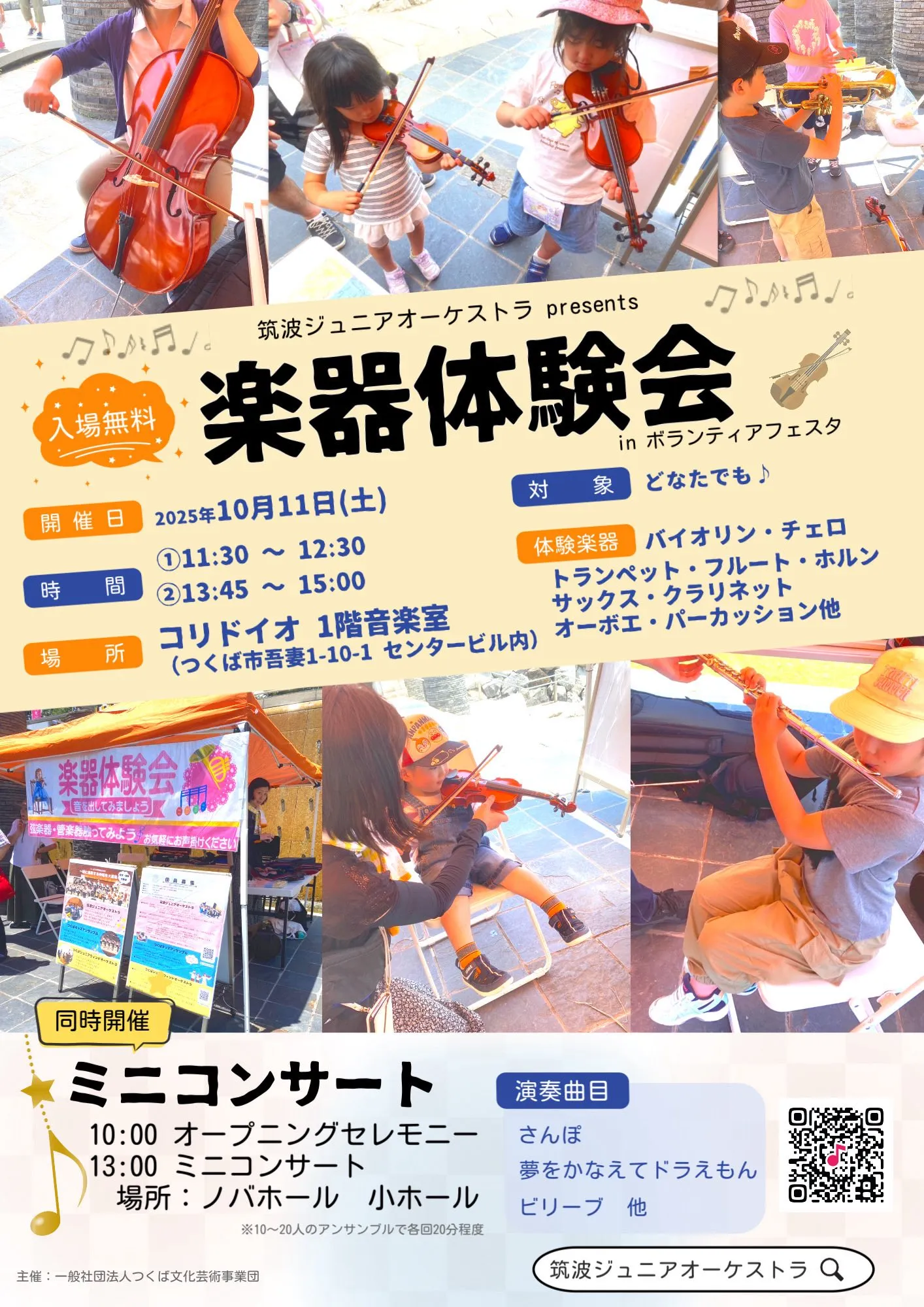 スケジュール | 10:00~ オープニングセレモニー 11:30~12:30 楽器体験会(コリドイオ 1階音楽室) 13:00~ ミニコンサート(ノバホール 小ホール) 13:45~15:00 楽器体験会(コリドイオ 1階音楽室) |